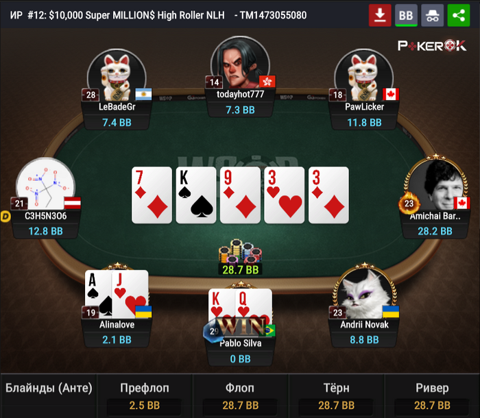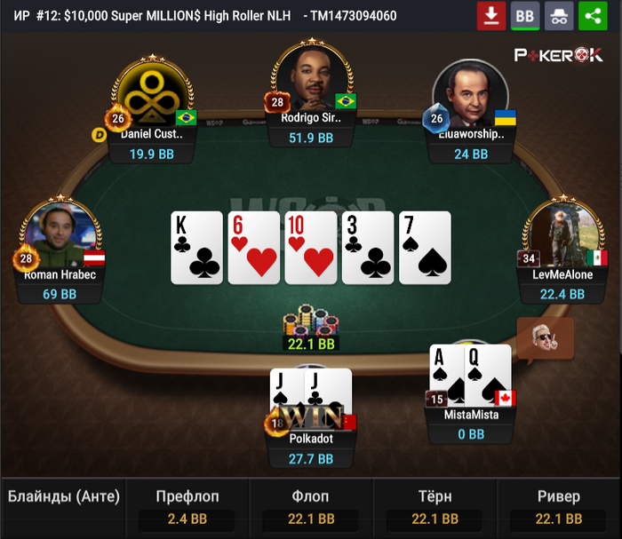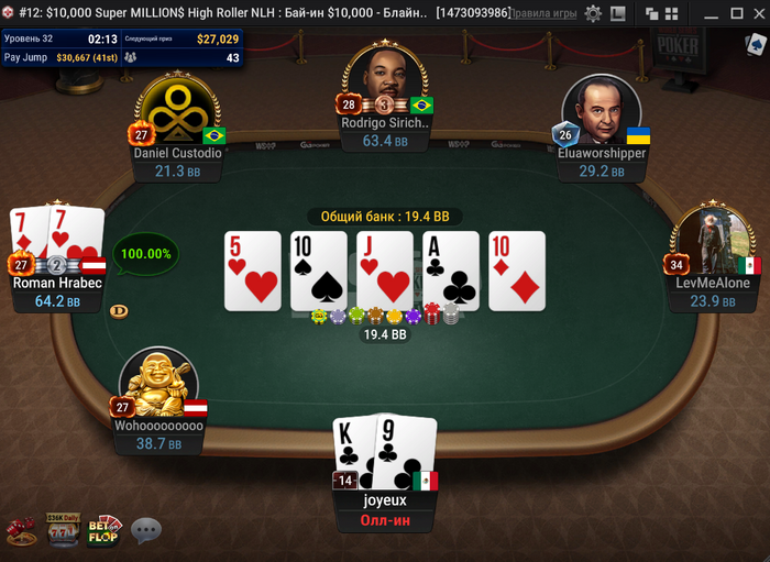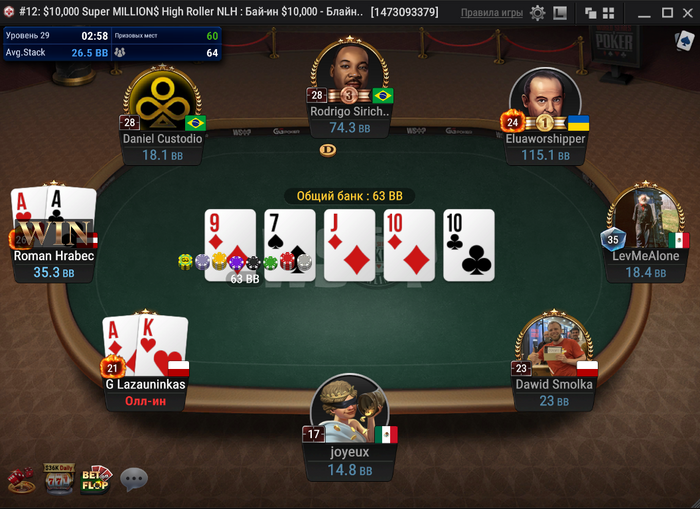 Крис Клодники удвоился до 17,7 ББ против Матиаса Айбингера: > . У последнего осталось 10 ББ.
