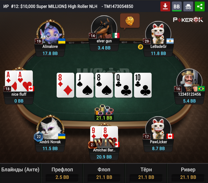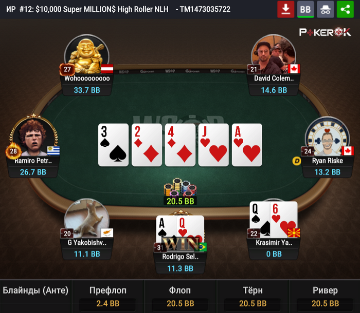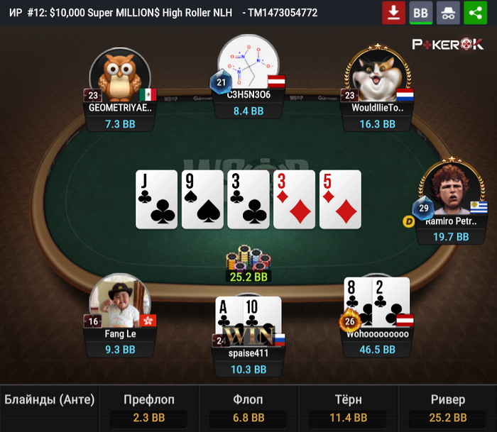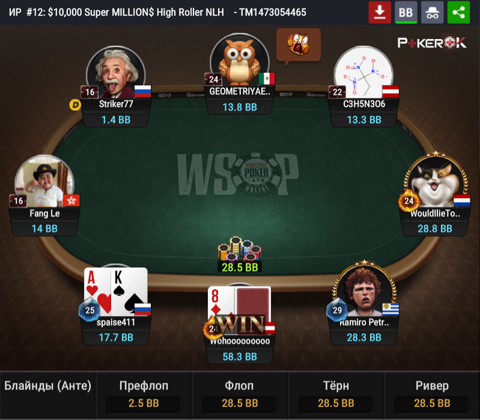 Рамиро открылся, Wohooooooooo трибетнул. spaise411 выкинул . Экшен продолжился 4-бетом 13 ББ и пасом на 5-бет! Wohooooooooo показал восьмёрку.