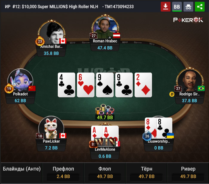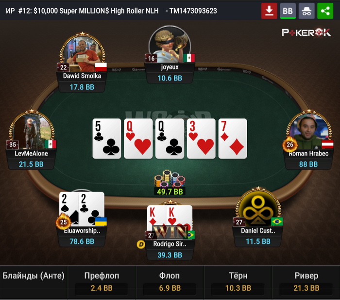 Родриго Сиричук вернулся на первое место в чипкаунте. Eluaworshipper надеялся найти у него блефы, но там была рука лучше.