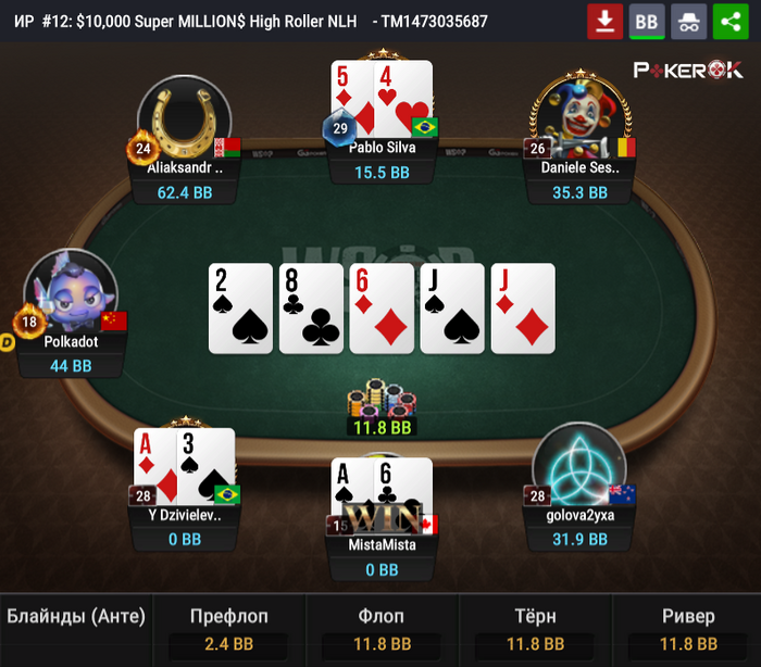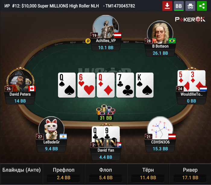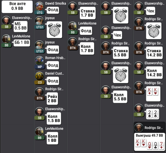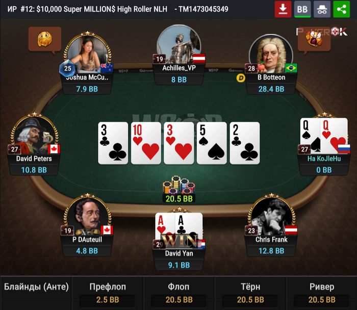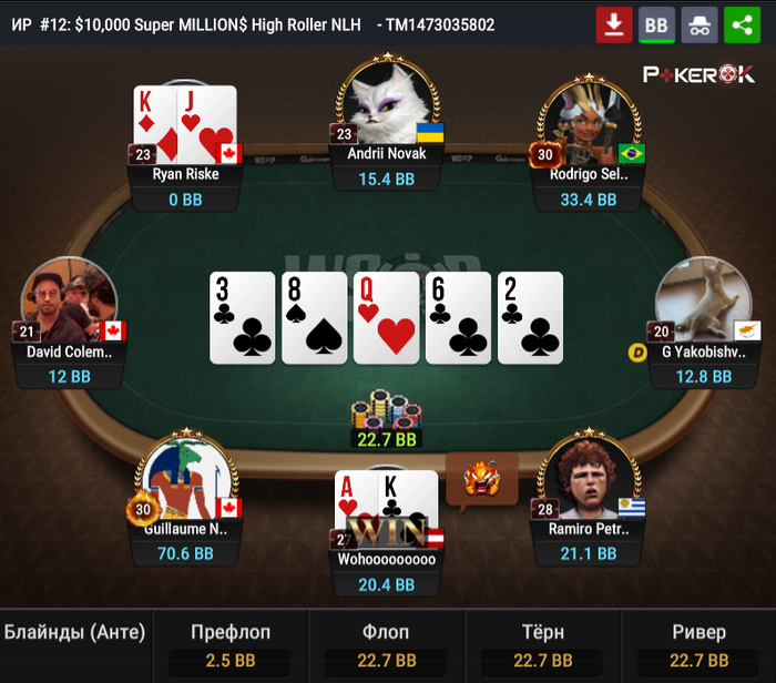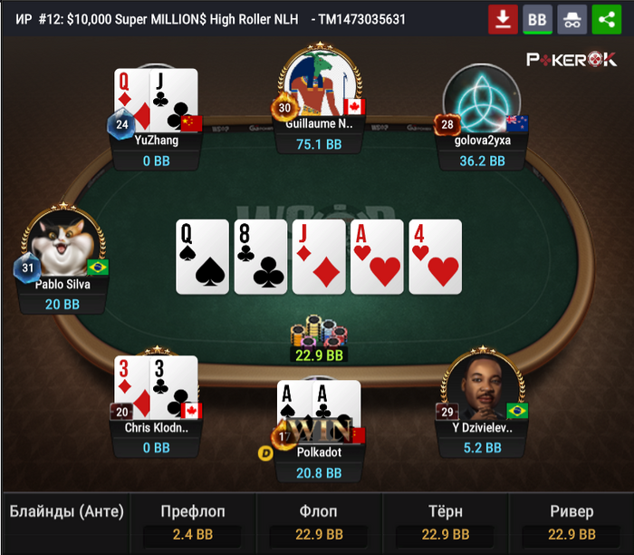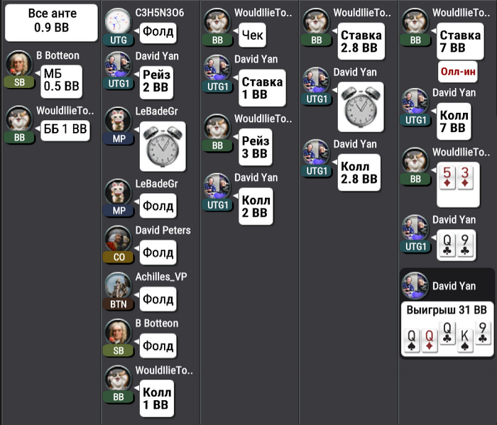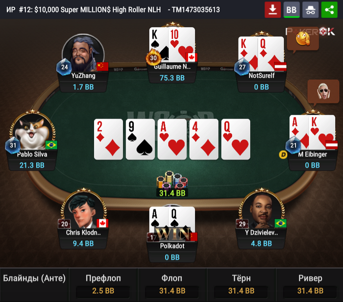 ...а потом ещё двоих. У Криса было 10 ББ, у Юйчжана всего 1,5 ББ.