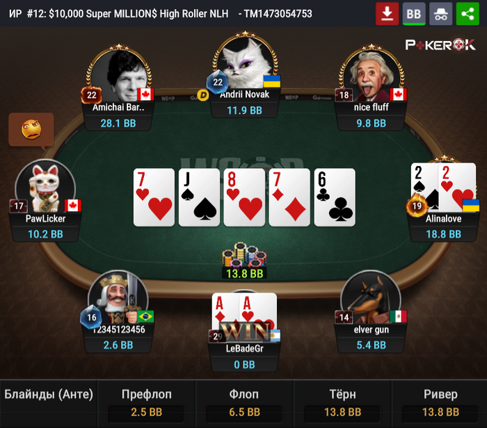 И снова тузы помогают с удвоением. Рейз на полстека, колл. На флопе Alinalove сделала лид под весь стек.