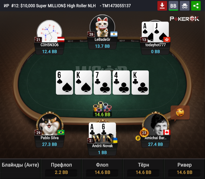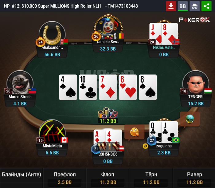 Алексей Вандышев с тузами удвоился, но уже в следующей раздаче сам стал их жертвой, вылетев на прямом баббле!