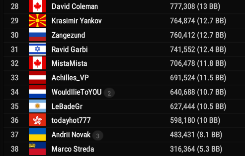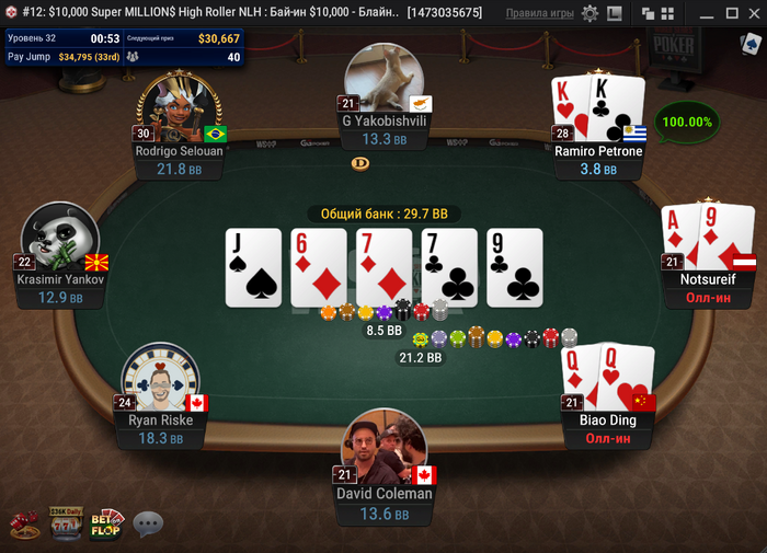 Рамиро Петроне запушил королей в двух коротких. Notsureif (не путать с другим прошедшим в деньги NotSureIf) заколлировал с двумя блайндами, а на ББ были дамы! Минус два.