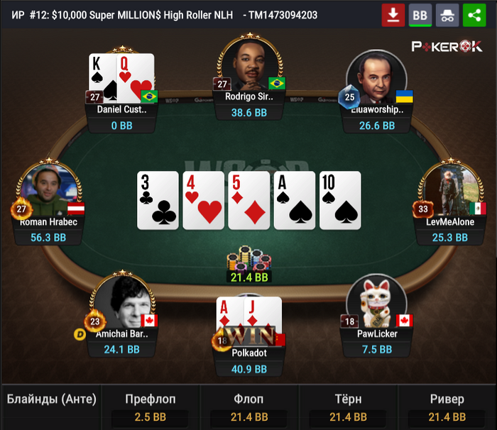Polkadot уже стал чиплидером! Кустодио сыграл 3-бет пуш 10 ББ в его рейз и последовал колл. 28 в игре.