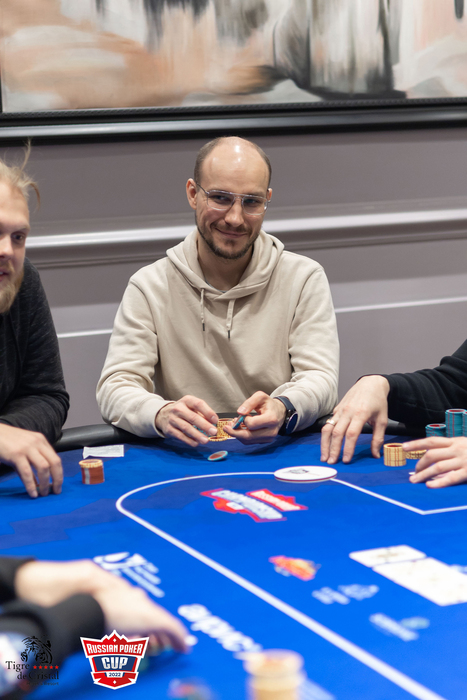 Бланковый ривер сделал Юрия чиплидером турнира. У него около 170,000. Сергей Ким сделал ре-энтри, как и Борис Молоков, который лишлися всех фишек на другом столе.