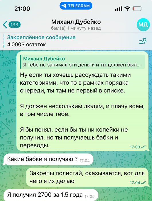 AggroGossu @ 18.04.24Тс обещал писать тут про закрытые долги, за год ничего не написано и лично мне ни копейки не было возвращено , общаться с тс в личке то еще развлечение. Не понимаю как у такого человека еще осталась репутация, что бы люди ему верили и играли через него в приложениях .
