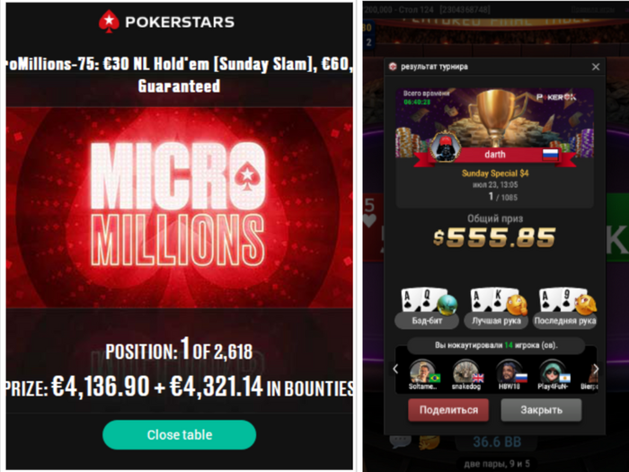 Герой воскресного вечера 💥happyweeke(Андрей), Который подеждает в килополяне MicroMillions €30 NL Hold'em [Sunday Slam], €60,000 Guaranteed и победа ему приносит 8458€!💪