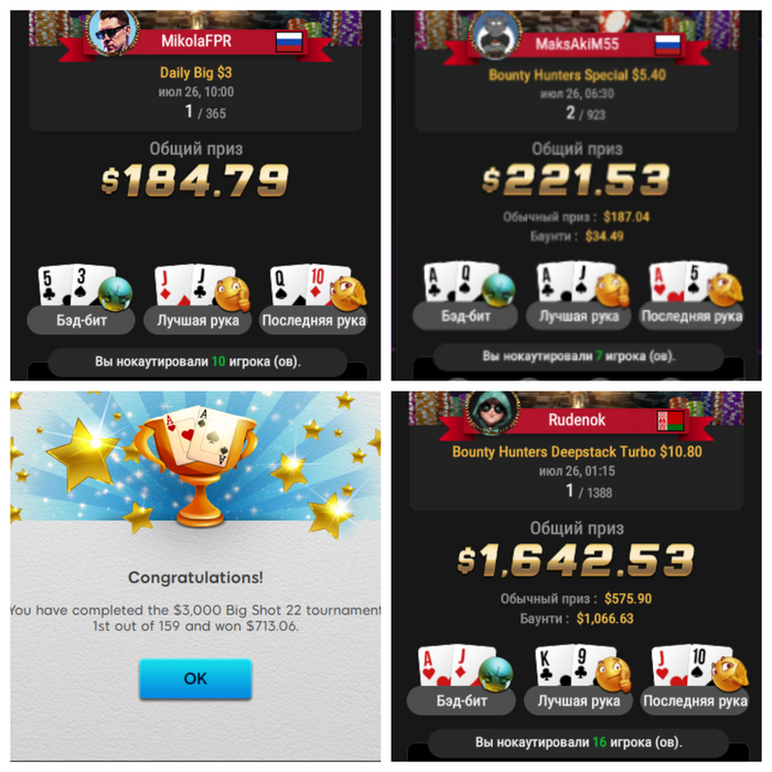 💥vassago Отличился сразу в трёх трурнирах. Заняв топ 2 в турнире Deep Run -€ 10 и заработав 397€! Победил в турнире на Покер кинг PKO Turbo -💲4,000 GTD за 16,50$ и заработал в нем 916$! и как вишенка на торте, занял топ 1 в турнире на PSes Progressive KO €10, €-1,000 Gdt и заработал в нем 417€!