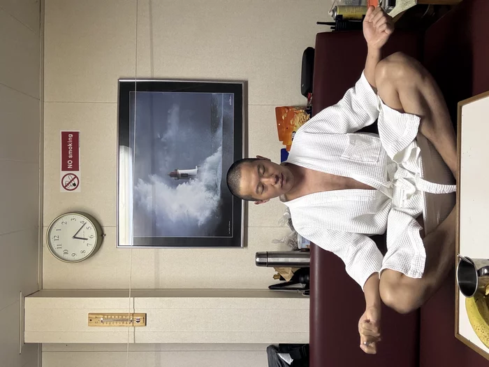 ну ничего, буду работать) все условия даны, главное делать что либо на постоянной основе и будет результат. выложу несколько свежих фото. Посадка была в Тайланде. После заселения в отель, мы с ребятами взяли такси до Паттаи, погуляли на «прогулочной»улице. Всюду слышали ароматы радости и счастья)) рядом коллега с филипин - моторист Тимати. Держу в руках гитару складную, первый раз вижу такое. Очень удобно возить с собой в поездки, особенно в море. Сижу медитирую в халате ( спер из отеля) ну уж очень хорошая штука. не успел приехать, как у одного дизеля с трубы черный дым шел, пришлось все форсунки менять. дым теперь прозрачный) кормят хорошо. До связи. Каюту обустроил, кайф. Очень удобно фильмы всякие на ночь смотреть )
