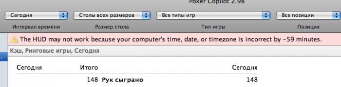 Путем удаления всей истории рук и повторного удаления копилота и установки, все заработало. Но осталась проблема, которая возникла после перевода часов (см картинку). Как ее исправить я пока не знаю (буду признателен за совет). Подозреваю, что из-за этого у меня все и заглючило после последнего обновления. Еще и раздражает, что теперь из-за этого статистика на столах на меня выводится только через час игры.
