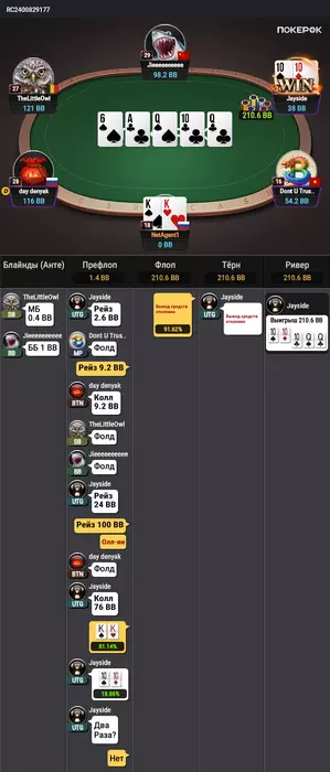 Вот самая страшная линия, которой меня научили в раше нл25 где я проиграл 2/3 банкрола. И научили на ривере жать по такой линии кнопку фолд, потому как в такой линии блефов почти никогда нет. Это без позиции чек-кол натса до ривера и на ривере чек-пуш, особенно если оппонент ставит. Даже нит в три чека будет ставить. С натсом по риверу рейза нет, только пуш, Меня отбивали даже по топ паре ривером. На дистанции больше заработаешь чем рейзами 3х по риверу.