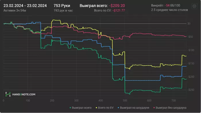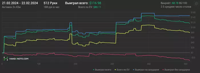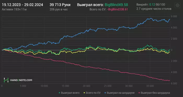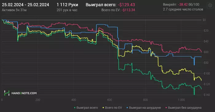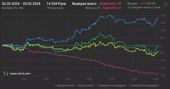 Недоволен количеством игры, всего 74 часа да и те 193 руки в час, по этому поводу хочу сказать увидимся в конце марта, в смысле я провел некоторую работу над психологией, плюс переезд позволил катать больше, в общем на март планы грандиозные, не жду что я резко начну бить 10бб/100 вот это все, ведь вера в то что это стрик уходит с такой же скоростью как ничтожные остатки моего капитала, тут скорее все проще, не бью и все. Но главное, что я готов к любому результату, не смотря на результат я готов катать, за февраль меня не один раз эти минусовые сессии сильно выбивали из графика. По работе вне столов все ок.