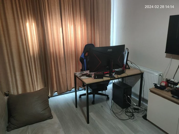 Ну и рабочее место, не знаю как его нормально сфотать, короче вот как есть. Самое главное, что я сейчас отдельно там сижу, никому не мешаю, мне никто не мешает и я могу встать, размяться, поскрипеть стулом, поскрипеть своими коленями и поясницей, чай могу сделать в перерыве, короче кайфую.