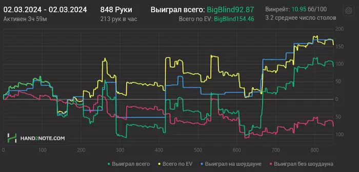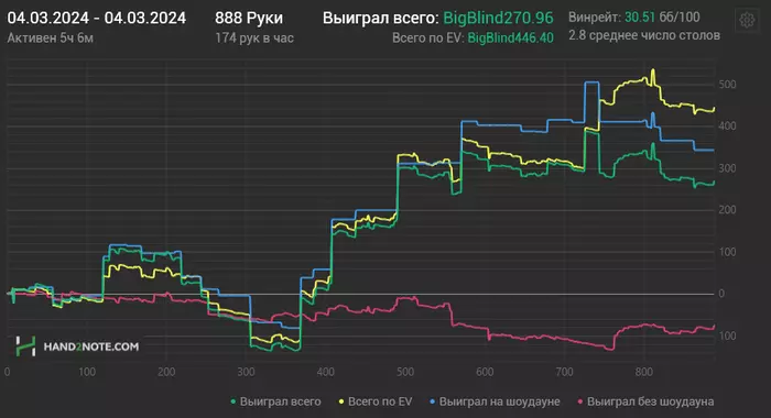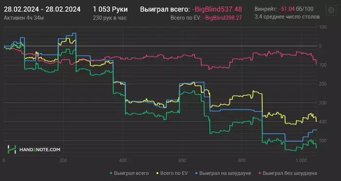 Это я к тому, что ожидания от игры на этих лимитах есть, но в ожидания я закладываю минимум 20к дистанции за месяц, а я что? Вчера я обосрался и сыграл 52 раздачи, такими темпами большой дом откладывается до никогда наверное. В общем сильно недоволен собой в этом направлении. Изначально я начал упарываться в техническую составляющую этой игры, ну блин я не выигрываю бабки, нужно работать над игрой. Да нужно, но за этим всем, моя менталка сказала я так больше не могу, ты совсем не обращаешь на меня внимания, я тебе больше не нужна, купила билеты к маме в деревню и уехала в закат.