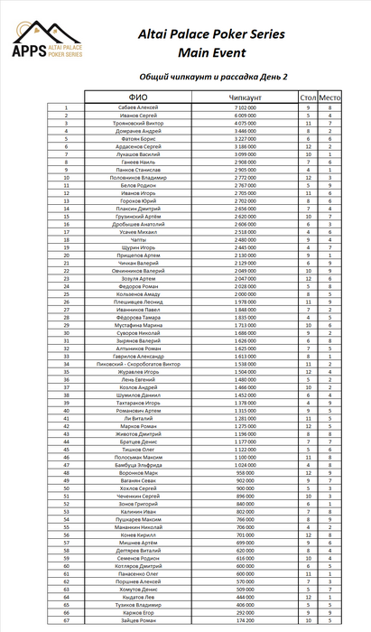 Main Event 1В.Уровень: 10, блайнды 10.000/20.000/20.000, в игре 45/74.