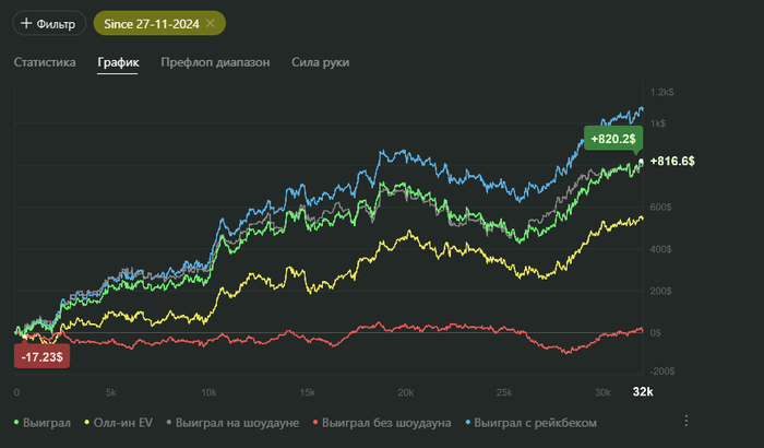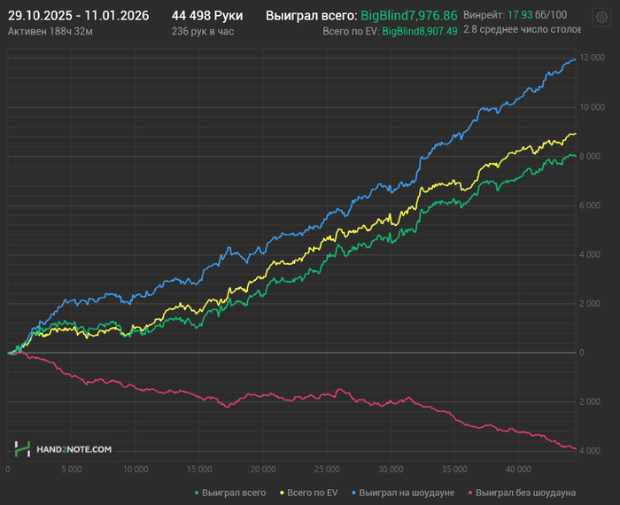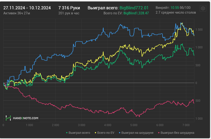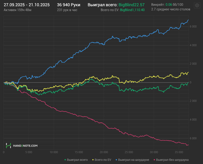 В еврорумах же наоборот всё прям гуд. Словил переап очевидно, суммарно идёт 6.4бб за всё время на нл20-50 (преймущественно 20).