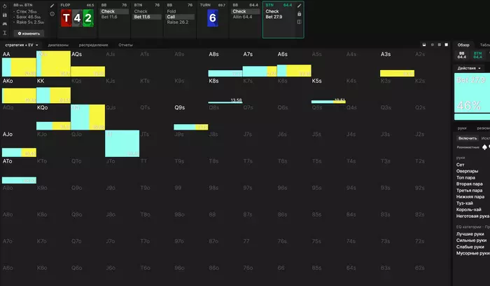 что мы видим в визарде? 100% чек! Потому что вышла карта отлично подходящая диапазону БУ. По всем остальным ранаутам ривера бет на месте ББ имеется. Самый редкий бет в районе 9% по выходу туза. Но по королю четко 100% чека. А в раздаче опп снепом пушнул. Получается что смотреть гто визард стоит. Но прям полностью перенимать выводы с него нет. Нужно обязательно анализировать самому, а сыграет ли так оппонент в реале.