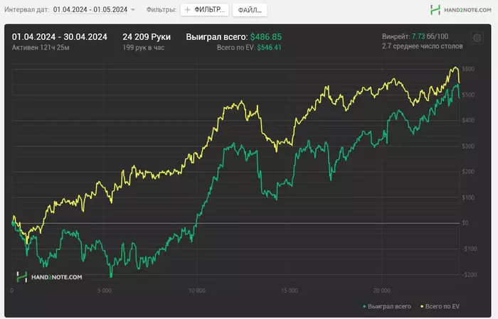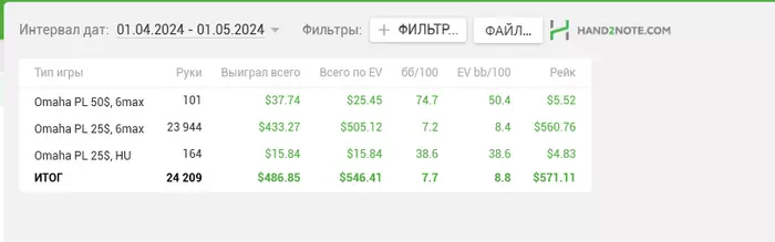 В мае хочется попытаться запрыгнуть на ПЛО-50 и закрепиться там, периодически миксуя 25-ый и 50-ый лимиты! Набить за 28 дней 1К$ рейка, тем самым увеличить РБ до 25%! Ну и продолжить конечно держать планку в +-5ББ /100!!!
