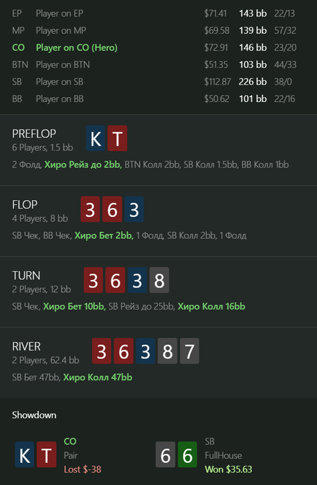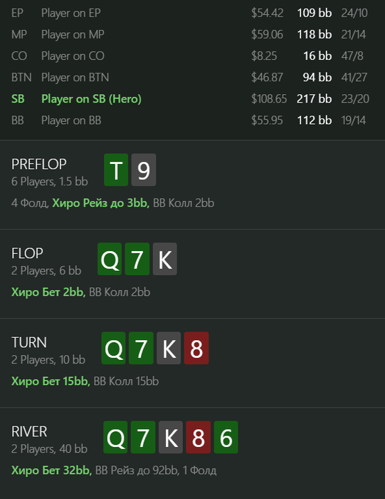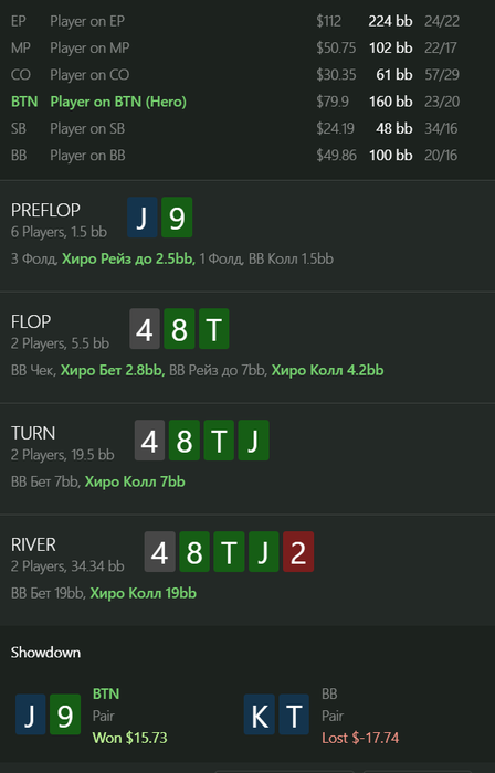 Поэтому я за колл. Превращать в блеф на ривере я J9 пока не умею, и не очень то и вижу смысл. Наскребется ли здесь на колл? Я, конечно, сильно сомневаюсь, но отталкиваюсь от собственного мышления, а оно сильно разнится с тем, что порою показывают оппоненты. Поэтому, видя такой ШД, я точно за колл, средней паршивости блафкетч - тоже блафкетч. Если такие руки, которую показал опп, хоть иногда там будут, то свои 25% мы сможем наскрести.