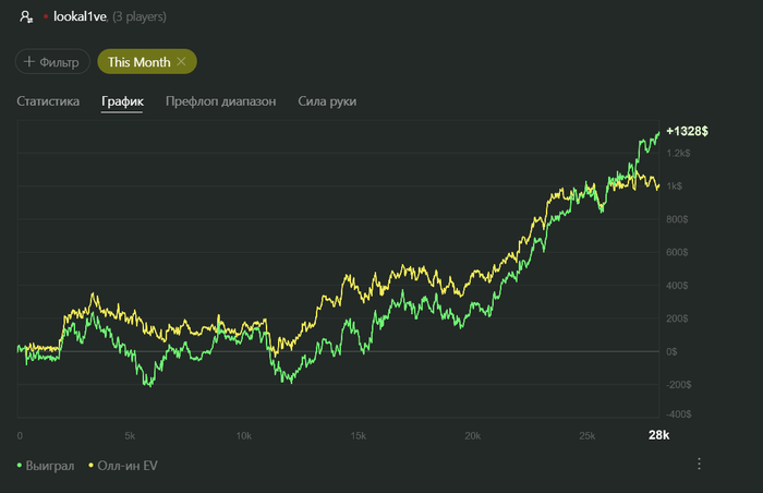 В последний день месяца уверенно переапался. С бонусами месяц 1620. Пока винрейт на 50 выше чем я ожидал (он такой же как на 25), правда красная совсем на дне, к счастью винрейт зависит не только от нее.