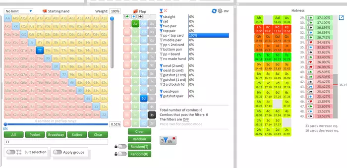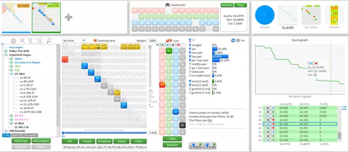 Есть такое понятие, как реализация эквити. Во Флопзилле это не посмотреть, надо солверы подключать. Навскидку, десятки тут плохо стоят именно по такой причине - они плохо реализуют свое эквити, потому что легко выблефовываются по приходу еще бродвея, а это примерно полколоды. 14% - это весь бродвей, плюс скорее всего не мелкие карманки, а сьютовые короли какие-нибудь, типа K8s+.