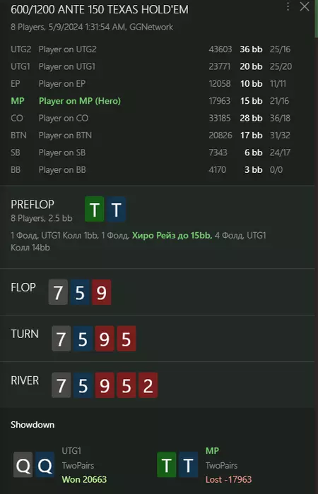 Есть оправдание. Был увлечен соседней раздачей, а тут увидел ТТ и пихнул машинально. О том, что это бабл и, самое важное, - о том, что передо мной был лимп от вменяемого игрока, узнал уже, когда фишки уехали, а обратно чот не поехали. Результат на табло. Крч, опять нотс купил за полтинник, хотя он тут и не нужен. И так примерно ясно, что там, и что делать с ТТ в такой ситуации.