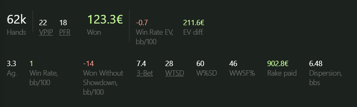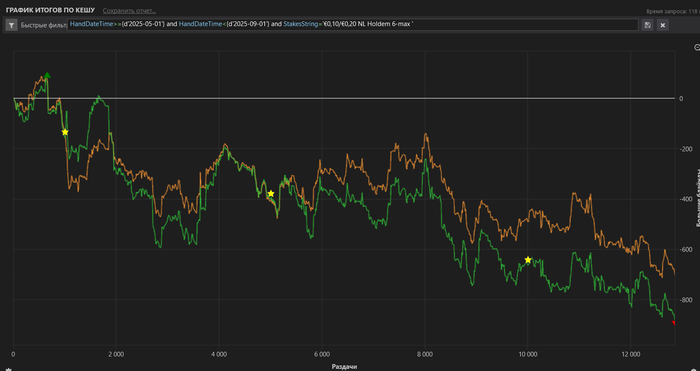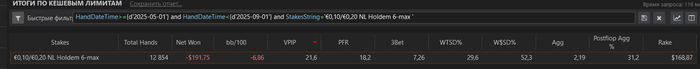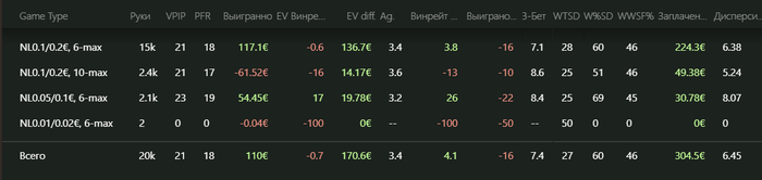 Очень неприятный отрезок с 15к рук. Дисперсия забрала своё за прошлый месяц. По итогам вместе с РБ фиксируем прибыль -€118. При том, что играл я почти всегда в прайм, с жестким селектом, под любителя 60, 70, 80, а иногда и 90+
