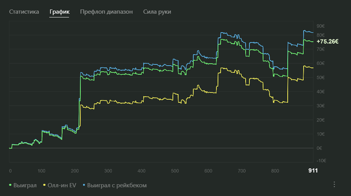 Заметил, что в процессе катки стало появляться внутри ощущение, в каком ране я сейчас нахожусь. Как сдают префлоп, как попадаешь в доски, как оплачивают \ не оплачивают, как часто упираешься в топ диапазона при блефе и тд. Можно оценить от 1 до 10, что круто, как будто немного начинаешь ощущать эфемерную "дисперсию" 😌