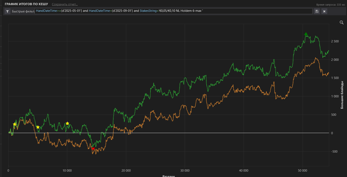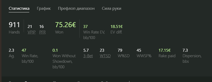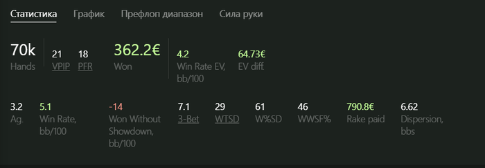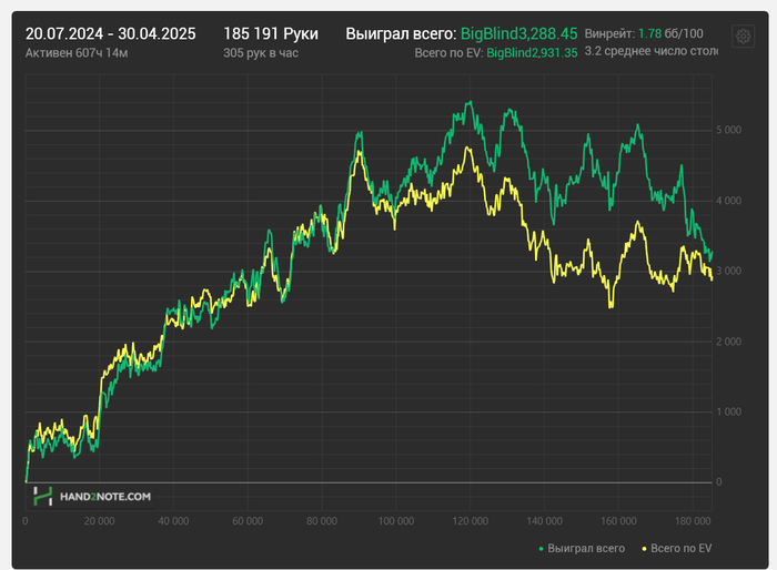 Разница в винрейте аж 10 бб \ 100. Оппоненты те же (лишь немного сложнее селектить), стратегия осталась ровно такая же (ничего не менял), поэтому пока непонятны причины такого результата. Ну еще есть запас в БР, так что буду играть дальше и надеяться попасть в приятный виток дисперсии). Благодаря РБ хотя бы заработал на пиво попить, не зря за компом картон раскидывал 😊
