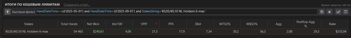 В начале месяца еще пытался играть NL20, но понял, что пока рано. Вывел часть БР, вернулся на постоянку на NL10. План показать на длительной дистанции хотя бы 5 бб \ 100, чтобы снова пытаться подняться