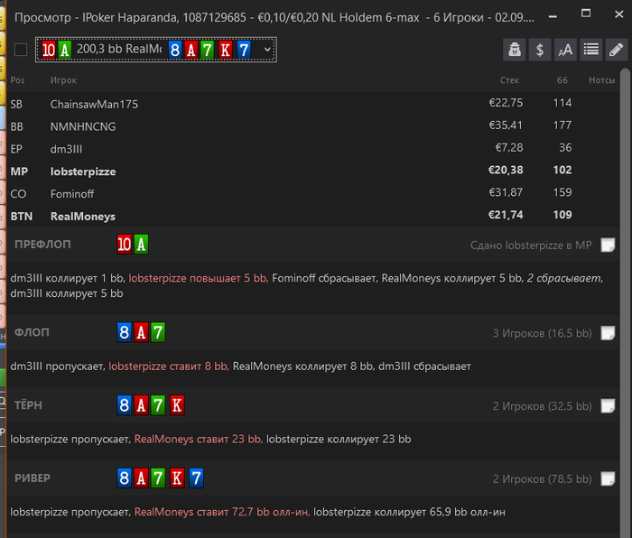 С мая играл НЛ10, а в начале августа тренер окнул подъём на НЛ20. Мол, игра не супер, но для этого лимита пойдёт + рейк меньше. Запланировал заранее БР, с которого я прекращаю играть этот лимит - 25 БИ, при начальном БР 35 БР. Дал шанс этому лимиту, так сказать, а не стал делать дефолтные шоты по 3-4 БИ