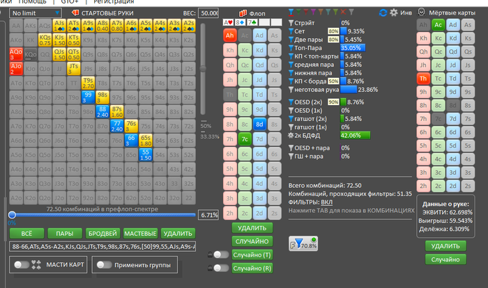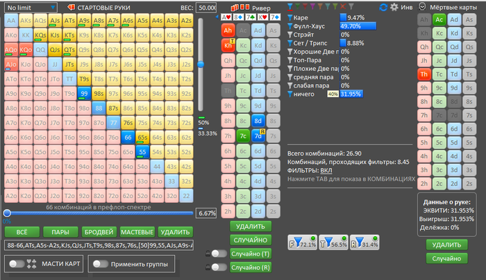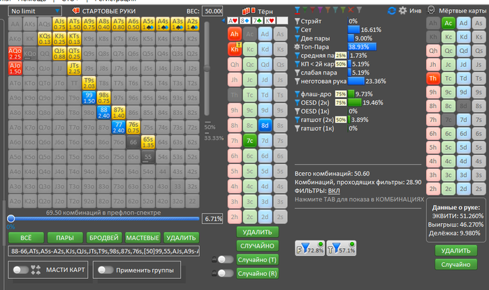 Ривер повтор 7, ФД не закрылось. В нас прилетает пуш. В моменте игры сразу подумал о том, что слишком узко он изображает, при этом промазавших рук хватает. В основном это Т9, 65, JT, часть ФД