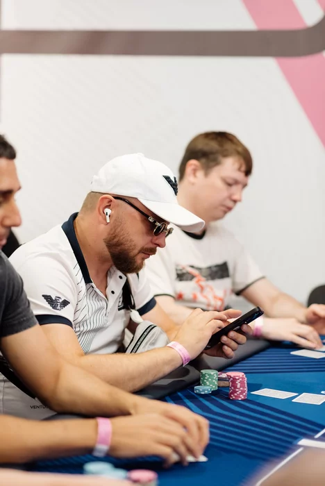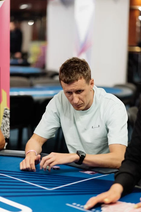 Первыми были Максим Громов и Ярослав Лигай. Максим ехал с в довольно уверенно, но уже на флопе мы увидели первого туза, а на терне второго.