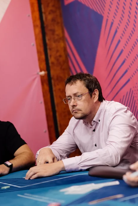 Следующим в кассу отправили Виталия Лисовского. Проиграл выставление с в Андрея Ботина. Кулер блайнд в блайнд. Доска: .