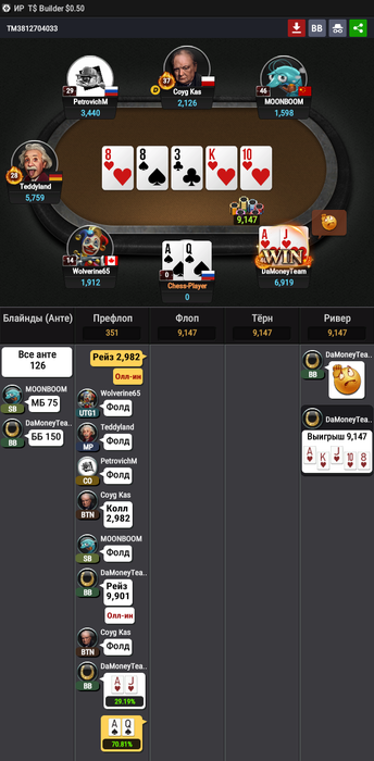 Всем привет. Загрузил на работе сегодня 2 турнира. В ноке болтало туда сюда. А вот в любимой $8.8 турбине все складывалось ок. Но потом пошла лютая просадка. В моменте когда в игре было 18 человек у меня оставалось 0.77 бб но я смог раскрутиться и в пике шёл 3/13. Увы проиграл 2 подряд олл ина за 2 стэк и выход на финалку. Получилось обидно что когда я выставился с KJ<99, чипак за другим столом принял 2 коротких и выбил их по итогу своим вылетом я организовал финалку. Очень было все потно такой лютый комбэк и так обидно 2 подряд проигранных олл-ина. Увы....🤮🤮🤮 За первое давали $700+