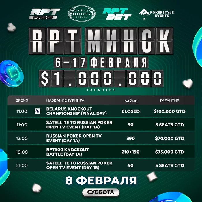 ❇️ В 18:00 начнем ещё один многодневный турнир $360 RPT300 KNOCKOUT BATTLE ($75 000 GTD). В дне 1А будут играть до ITM (12% участников) с уровнями по 30 минут. Фиксированная награда за выбивание оппонентов $150.
