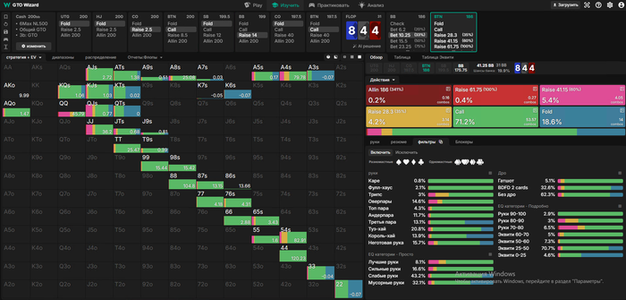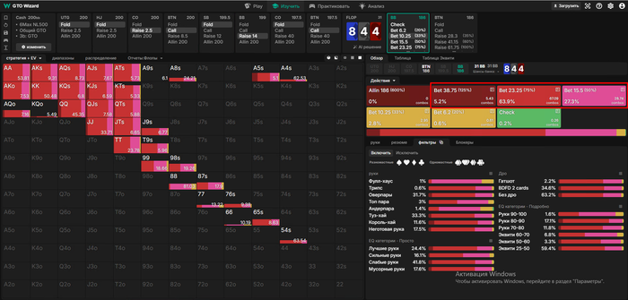 blanco, согласен по сайзингу, спасибо. Забил в солвер, треть имеет место, но менее 10%. Но тем не менее, ставка флопа кажется дефолтной в том числе и по солверу. На терне тоже продолжение - стандарт, но около четверти, я перестарался.