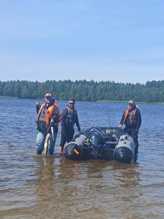 С трудом доносим лодку до воды, перекуриваем и капитан судна показывает все прелести новой покупки. Очень быстро! Сидим в четвером, а лодку поднимает. Покатались, закидываем удочки. Я, по традиции, ставлю самый большой воблер - всегда стараюсь поймать трофей =) Парни ставят чуть меньше. Буквально пол часа и у Антона ключет судак. Отпускаем, по весу меньше 1кг, таких не берем. Еще какое то время и Роман вытягивает белую рыбу. Вроде это жерех. Еще час и вот оно - у Антона мощная поклевка. 5 минутная борьба и экземпляр на 3.5кг у нас в лодке. Выловили еще одного крупного окушка и поехали в лагерь, обещали недолго.