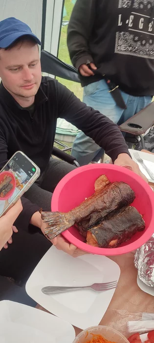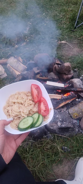 Нарезки, картошку в углях, копченую рыбу, макароны с тушенкой. Костер дается тяжело - дрова сырые, но справляемся.