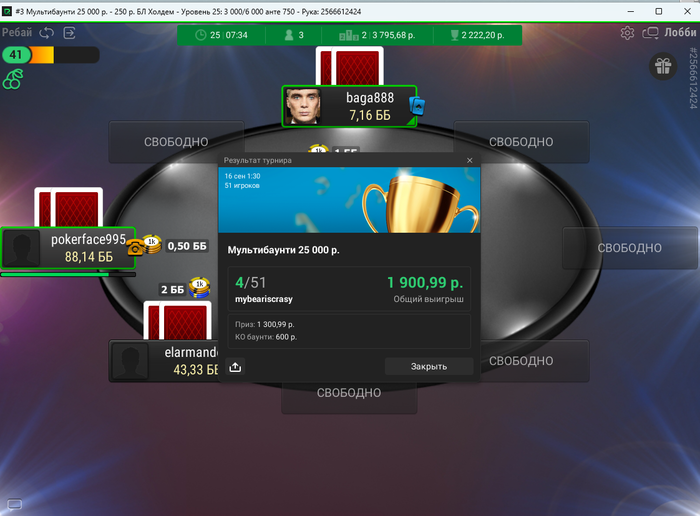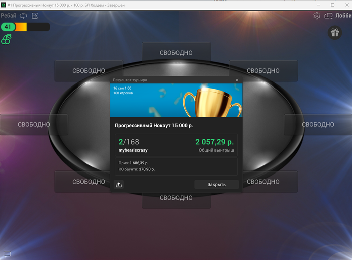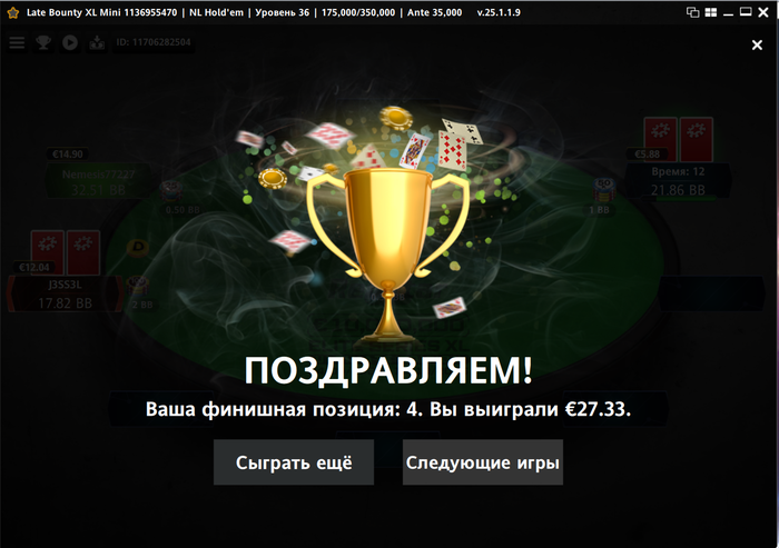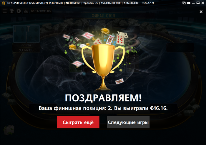Сегодня 11 сентября и на текущий момент я сыграл 31 турнир. Если играть безвыходных, то это получается по 22 турнира в день. А у меня запланирован отдых на 3 дня и один день буду работать официантом.