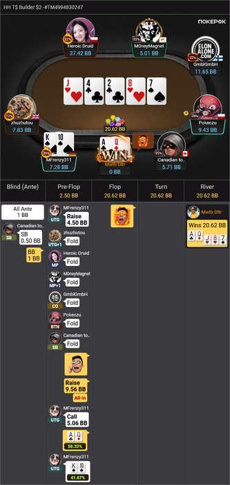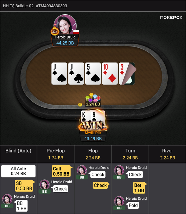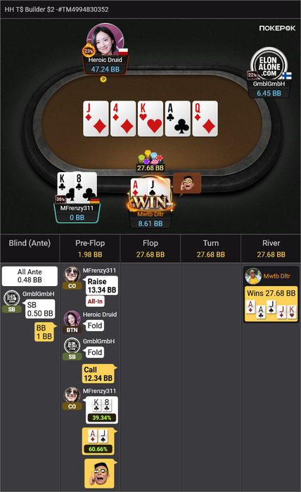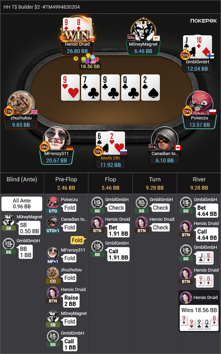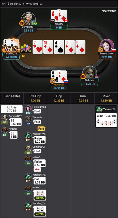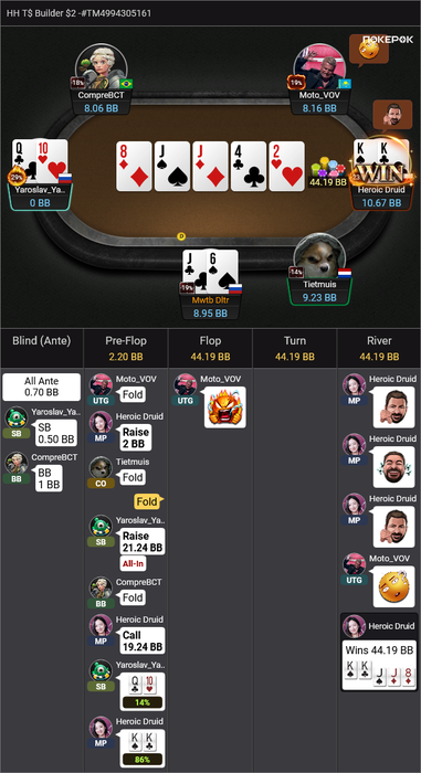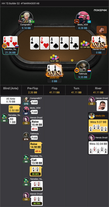 Heroic Druid пушит A4o, я репуш KQo в надежде на колл Yama, который тоже залетает, как я и ожидал.