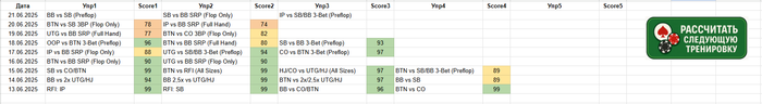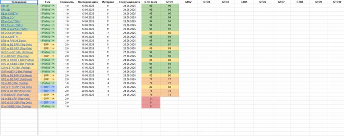 Вся работа по созданию плана обучения была выполнена в Google-Таблицах. Для отработки навыков использую GTO Wizard.