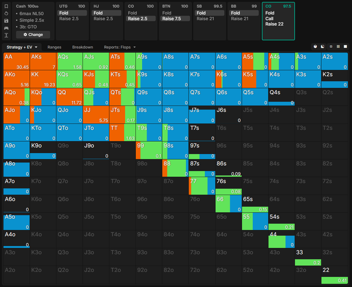 Визард играет страту полярного 3бета ББвБУ на нл50 по нескольким причинам: 1)из-за рейка 2)солвер играет против себя с открытыми картами. Это значит если он будет 3бетить недостаточно в частотах и недостаточно полярно, то БУ будет слишком оверфолдить. Он приходит к этому в большом количестве симуляций. Где он сначала 3бетит, допустим, мало. Видит оверфолды. Начинает добавлять. БУ начинает постепенно чаще колить. Но задачи частые коллы 3бета, когда мы ООП тоже не стоит. Плюс солвер понимает рейковую нагрузку ЗА ОБЕ СТОРОНЫ.