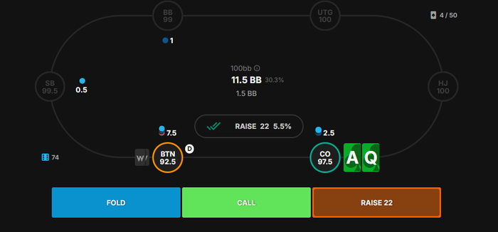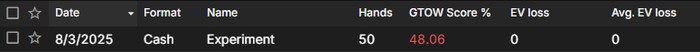 Мы открылись на CO с AQs и получили 3-бет от BTN. Наша рука индифферентна, то есть имеет одинаковое EV между рейзом и коллом. Но обратите внимание на соотношение частот этих двух действий. Во время эксперимента на протяжении 50 раздач я выбирал только в пользу рейза — действия с наименьшей частотой, при этом был активирован Low RNG. GTO Score, учитывающий и чистые ошибки, и ошибки микса, вышел довольно-таки низким, но обратите внимание на «EV loss». Оно равно нулю.