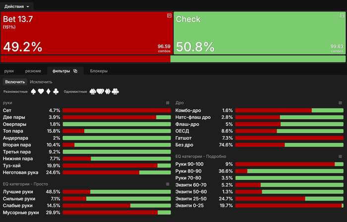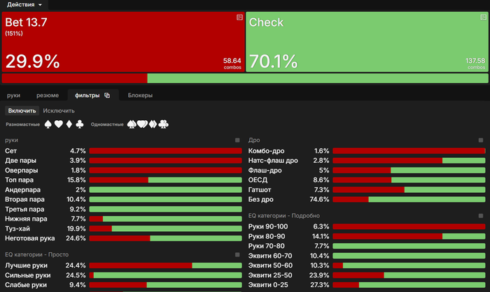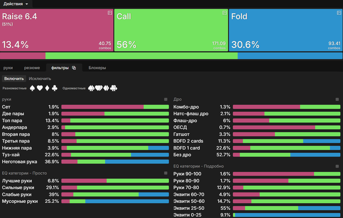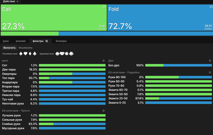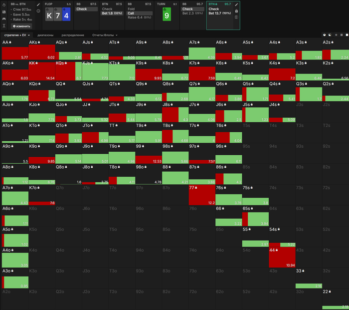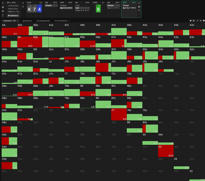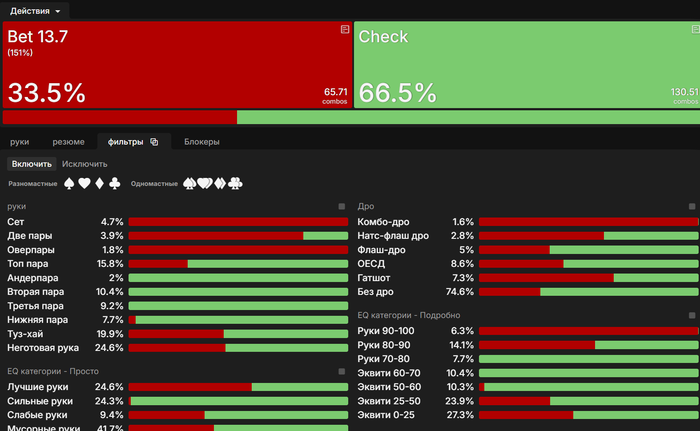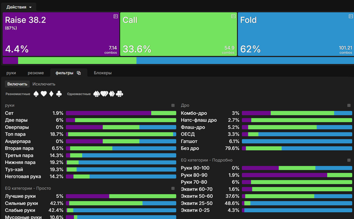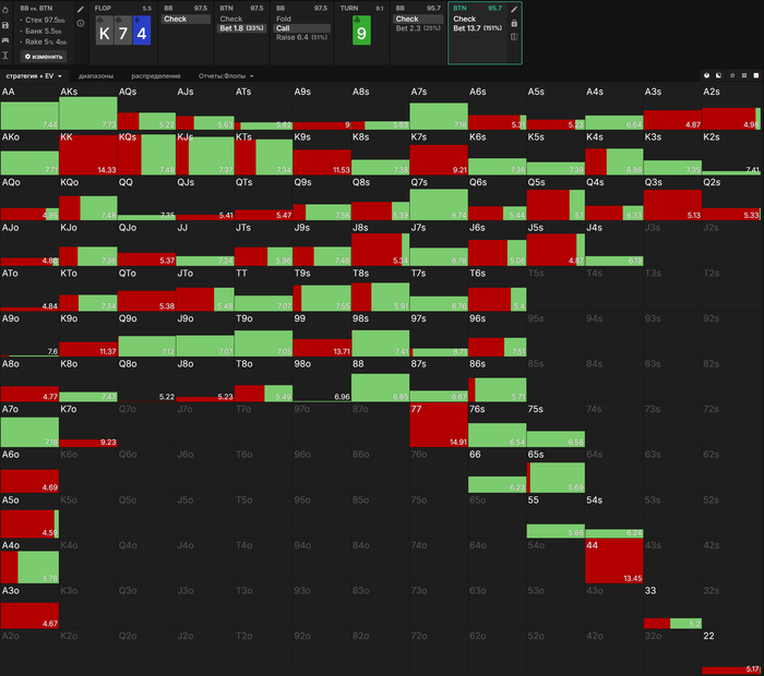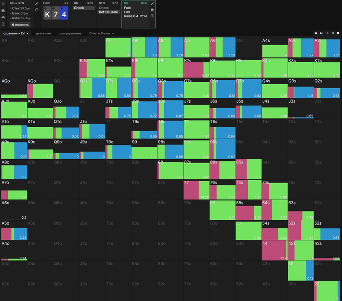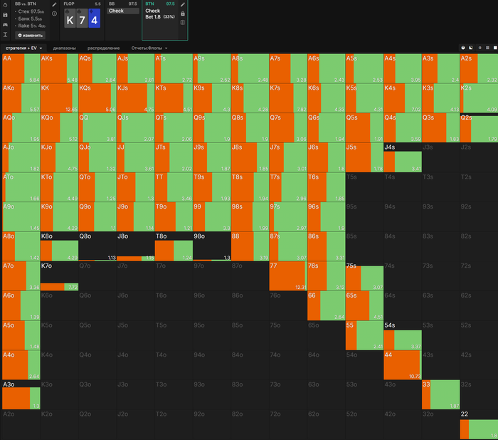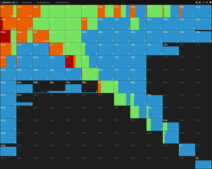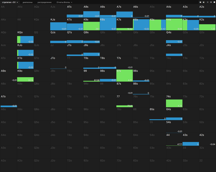 Привет. Большой пост, видно что старался. Полностью внимательно не читал, но по главным тезисам пробежался. И так как хочу помочь земляку в начале пути, поделюсь мыслями. Плюс мне кажется что ты уходишь не в ту сторону, по крайней мере для нл10 (и далее вплоть до нл200 все лимиты тоже касается). НЕ НУЖНО страдать ГТО головного мозга. Не нужно здрачивать тренажер префлоп, частоты и тд. Тебя никто не накажет за то что у тебя АДс в 4бете СОвБУ в частоте 25% вместо 10%. Или что у тебя не будет вообще в 4бете К6с так любимые солвером.