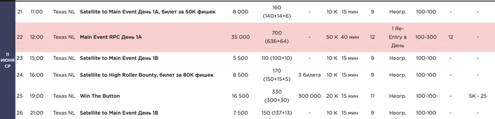 В 12:00 стартует Main Event RPC 1В с бай-ином 700 у.е. и уровнями по 30 минут. В стартовых флайтах сыграют по 12 уровней, регистрации во второй день нет. В этом турнире можно сделать только по одному ре-энтри в каждом флайте!