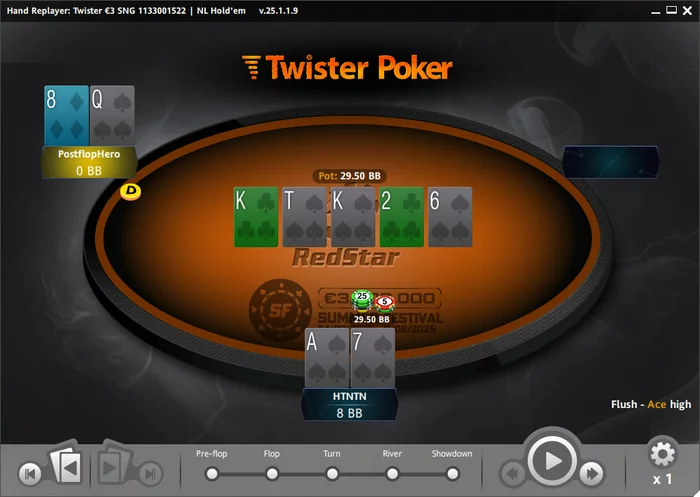 Флоп терн я играл двумя ставками по трети, ривер запихнул олл ин 9бб, опп рег, если что. Не думаю, что в таком споте мы будем выигрывать 1 из 3 банков с Q8, даже с блокером на флэш.
