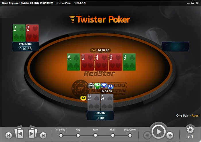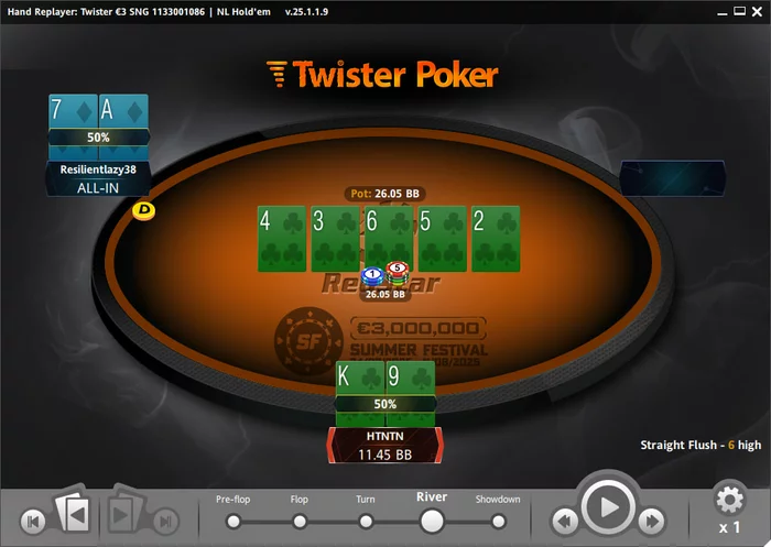 День начался с двух очень трешовых моментов, которые произошли буквально в первый час. Сначала я умудрился проиграть спин оппоненту, у которого стек был в 249 раз меньше, выглядело это вот так: