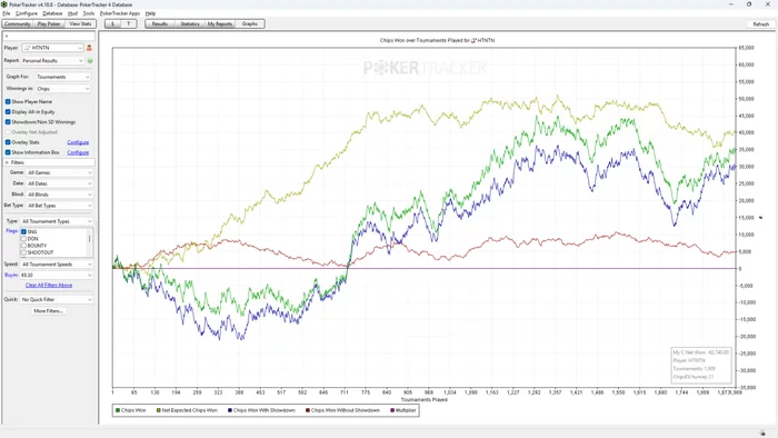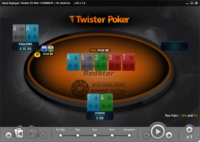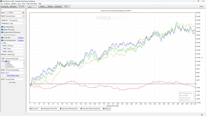 Наконец то получилось выдать хорошее чипев, общее на тройках стало 42, что уже хоть как то радует. Параллельно отыграл билеты с лидерборда (Там было 4 билета по 5 евро), но там было вообще без шансов, залил все 4 спина. Энивэй очень доволен своей игрой и результатом, завтра постараюсь отыграть под 400, а потом 2 дня отдохну от покера.