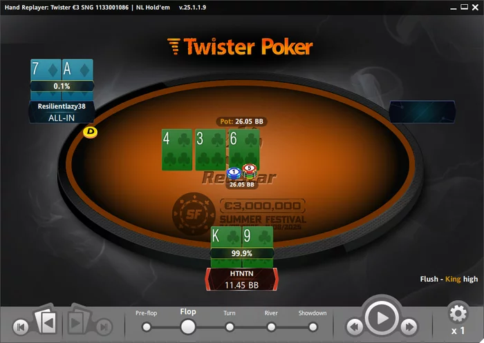 После этого, через 5 минут умудрился поделить пот после 99.9% по флопу, давно такого не видел.